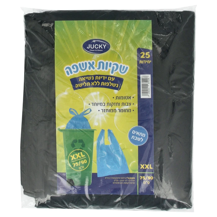תיאור מפורט: שקיות אשפה גדולות עם ידיות נשיאה נוחות בצבע שחור! השקיות מיועדות לשימוש יומיומי במטבח, במשרד ובעסק מגיעות באריזה של 25 יחידות. עשויות מחומר עמיד ואיכותי עבה וחזק. הידיות המובנות מאפשרות נשיאה נוחה וקלה לפח החיצוני. השקיות נשלפות בקלות ללא קריעה או תלישה - מיועד לשבת!